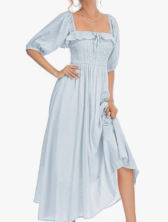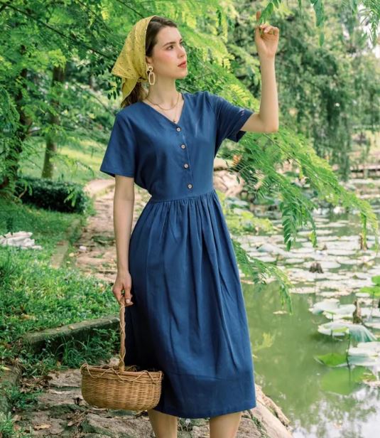 Here is a vintage style cotton blend nap dress that has a lightweight fabric that is flowy and lovely. It’s a midi dress that has a square neckline and an empire waist. The puff sleeves are absolutely perfect and it’s a good choice for meadow walks, gardening and baking.