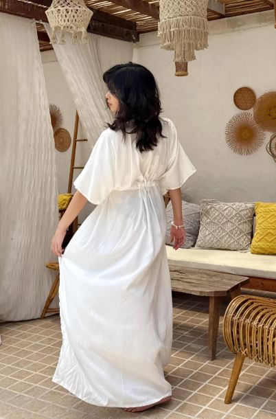 Here is a handmade white kaftan dress has that relaxed, oversized shape that’s so comfy to wear. It’s long and flowy, perfect for lounging or adding a boho touch to your day. Love how simple and airy it feels. A timeless piece you can style so many ways.