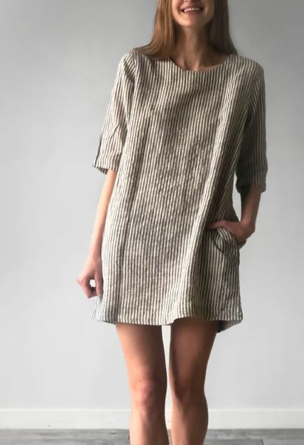 This sweet little nap dress has a comfy relaxed fit and hits above the knee for a cute mini look. The gathered waistline and button details at the bodice add just enough charm without feeling fussy. Made from a soft linen-cotton blend that isn’t see through, it feels light and airy. I love that the linen is eco-friendly and keeps getting softer every time you wear it.