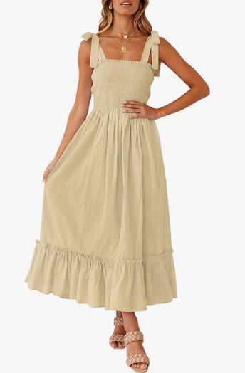 With a soft color, this boho dress has thin spaghetti straps and a pretty square neckline that gives it a sweet, simple look. It’s light and breezy, perfect for warm days or layering. Easy to slip on for a relaxed style. A great pick if you love a soft boho vibe.