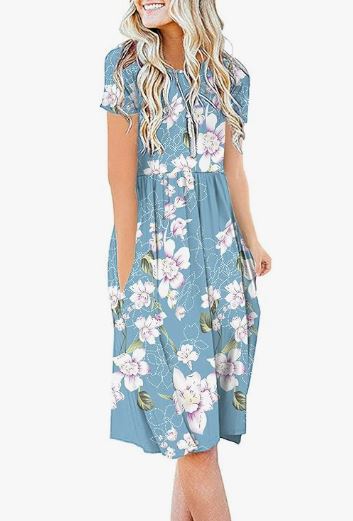 This pretty floral dress with short sleeves is made from a lightweight fabric that feels so breezy and soft. It’s one of those dresses you can slip on without thinking and still look put together. I love how easy it is to move around in, whether you’re lounging at home or stepping out for a quick walk.